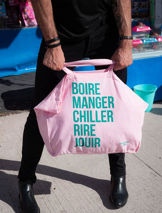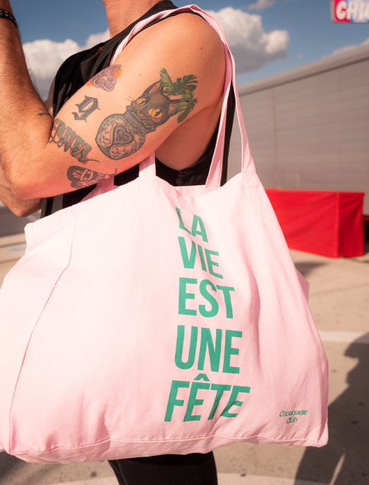 Tote bag XL en coton bio "La vie est une fête" rose et vert